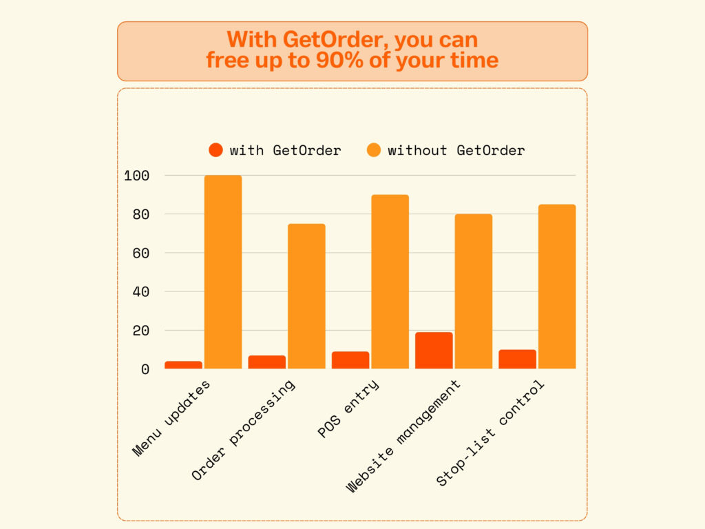 According to restaurant owners already using GetOrder, the platform reduces up to 90% of the time their staff used to spend on: